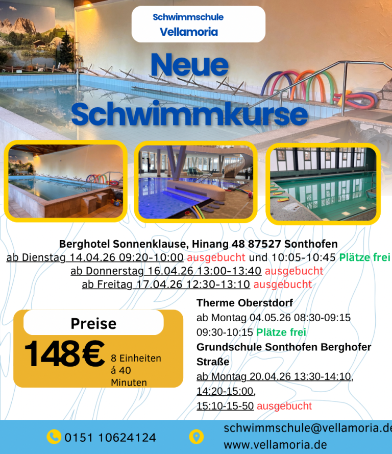In Zusammenarbeit mit dem familiengeführten Berghotel Sonnenklause bei Sonthofen biete ich Schwimmunterricht inmitten der beeindruckenden Allgäuer Bergwelt an. Das Hotel, umgeben von saftig grünen Almwiesen im Sommer und schneebedeckten Berggipfeln im Winter, bietet auf 1100 Metern Höhe eine ideale Kulisse für meine Schwimmstunden. Nur 11 Minuten von Sonthofen entfernt, ermöglicht diese Kooperation eine einzigartige Lernerfahrung für Kinder in einer inspirierenden Umgebung.