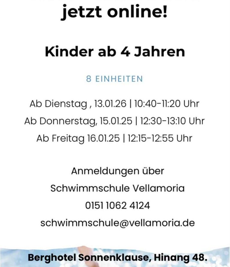 In Zusammenarbeit mit dem familiengeführten Berghotel Sonnenklause bei Sonthofen biete ich Schwimmunterricht inmitten der beeindruckenden Allgäuer Bergwelt an. Das Hotel, umgeben von saftig grünen Almwiesen im Sommer und schneebedeckten Berggipfeln im Winter, bietet auf 1100 Metern Höhe eine ideale Kulisse für meine Schwimmstunden. Nur 11 Minuten von Sonthofen entfernt, ermöglicht diese Kooperation eine einzigartige Lernerfahrung für Kinder in einer inspirierenden Umgebung.